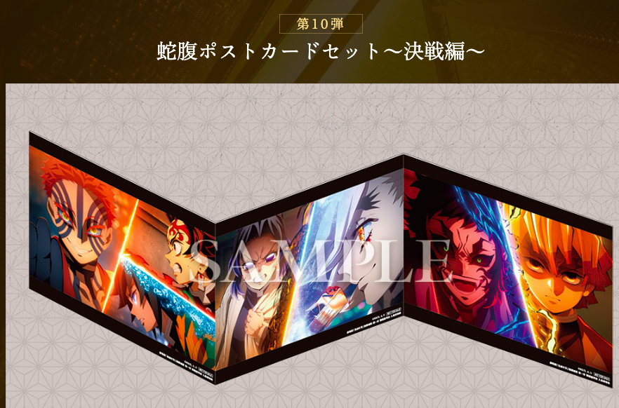 決戦CMの場面写真を使用した蛇腹型のポストカードセットで、そのまま飾っても、1枚ずつ切り取ってもお楽しみいただけるアイテムです。それぞれの呼吸や血鬼術の部分にはクリアコーティング加工を施したスペシャル仕様になっております。